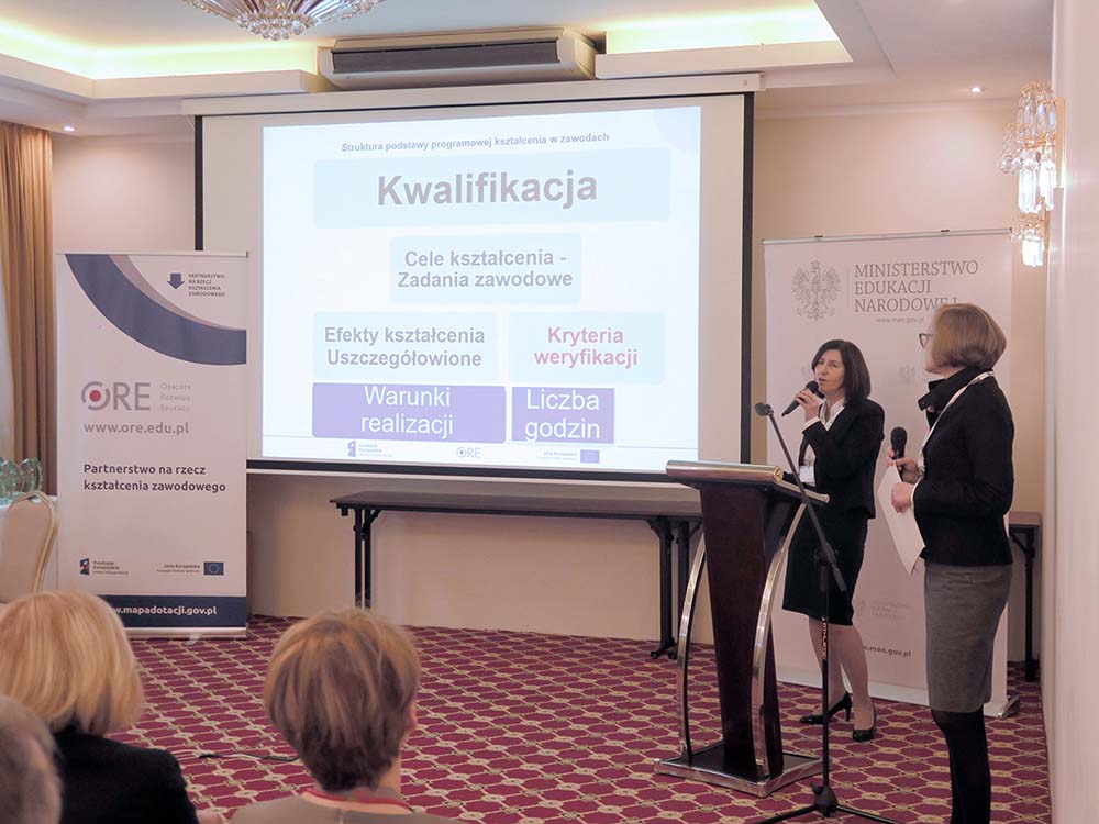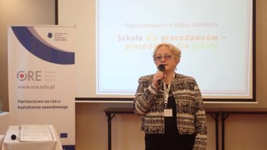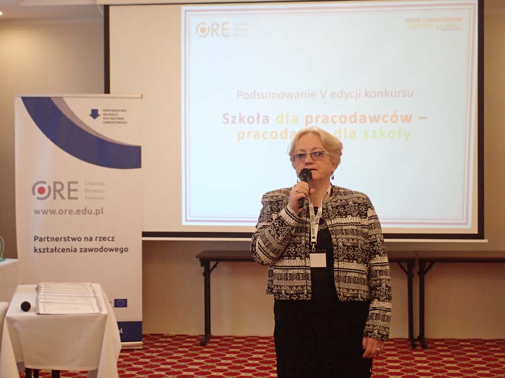 Wicedyrektor ORE Bożena Mayer-Gawron podsumowała projekt „Partnerstwo na rzecz kształcenia zawodowego. Etap 1: Forum Partnerów Społecznych”. Celem projektu było dostosowanie kształcenia i szkolenia zawodowego do potrzeb rynku pracy poprzez zaangażowanie przedstawicieli pracodawców i pracowników na wszystkich etapach jego programowania. W ramach projektu zaplanowano główne zadania do realizacji dotyczące przeglądu i aktualizacji dokumentów programowych szkolnictwa zawodowego, a także opracowania zmodyfikowanych podstaw programowych kształcenia w zawodach (PPKZ) oraz suplementów do dyplomów i kwalifikacji.