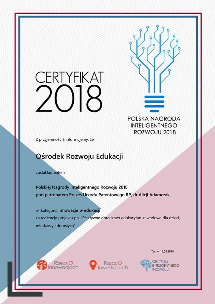 Z radością informujemy, że Ośrodek Rozwoju Edukacji w Warszawie został laureatem Polskiej Nagrody Inteligentnego Rozwoju 2018 pod patronatem Prezes Urzędu Patentowego RP za projekt „Efektywne doradztwo edukacyjno-zawodowe dla dzieci, młodzieży i dorosłych”. Do sukcesu ORE przyczyniła się także praca Departamentu Kształcenia Zawodowego i Ustawicznego Ministerstwa Edukacji Narodowej (obecnie Departament Strategii, Kwalifikacji i Kształcenia Zawodowego MEN), który opracował fiszkę projektu i nadzorował go merytorycznie oraz praca Departamentu Funduszy Strukturalnych MEN, który nadzorował projekt pod względem finansowym. Pragniemy przy tej okazji podziękować pracującym na rzecz projektu Ekspertom i Autorom. Dzięki ich profesjonalnemu zaangażowaniu powstały programy preorientacji i orientacji zawodowej, programy doradztwa zawodowego, wzorcowe rozwiązania organizacyjne dotyczące funkcjonowania Wewnątrzszkolnego Systemu Doradztwa Zawodowego, a także rekomendacje do rozporządzenia MEN w sprawie doradztwa zawodowego, które przyczynią się do podnoszenia jakości działań doradczych w systemie oświaty.