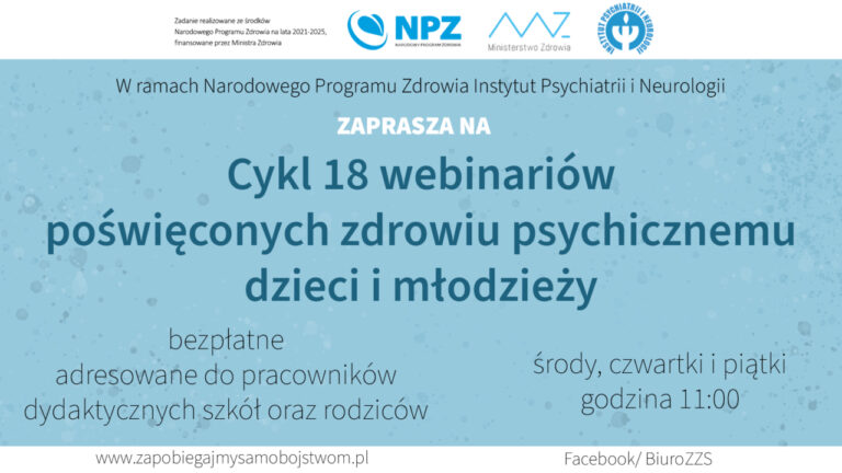 finansowanych przez Ministra Zdrowia, Instytut Psychiatrii i Neurologii przygotował cykl 18 webinariów dotyczących zdrowia psychicznego dzieci i młodzieży.