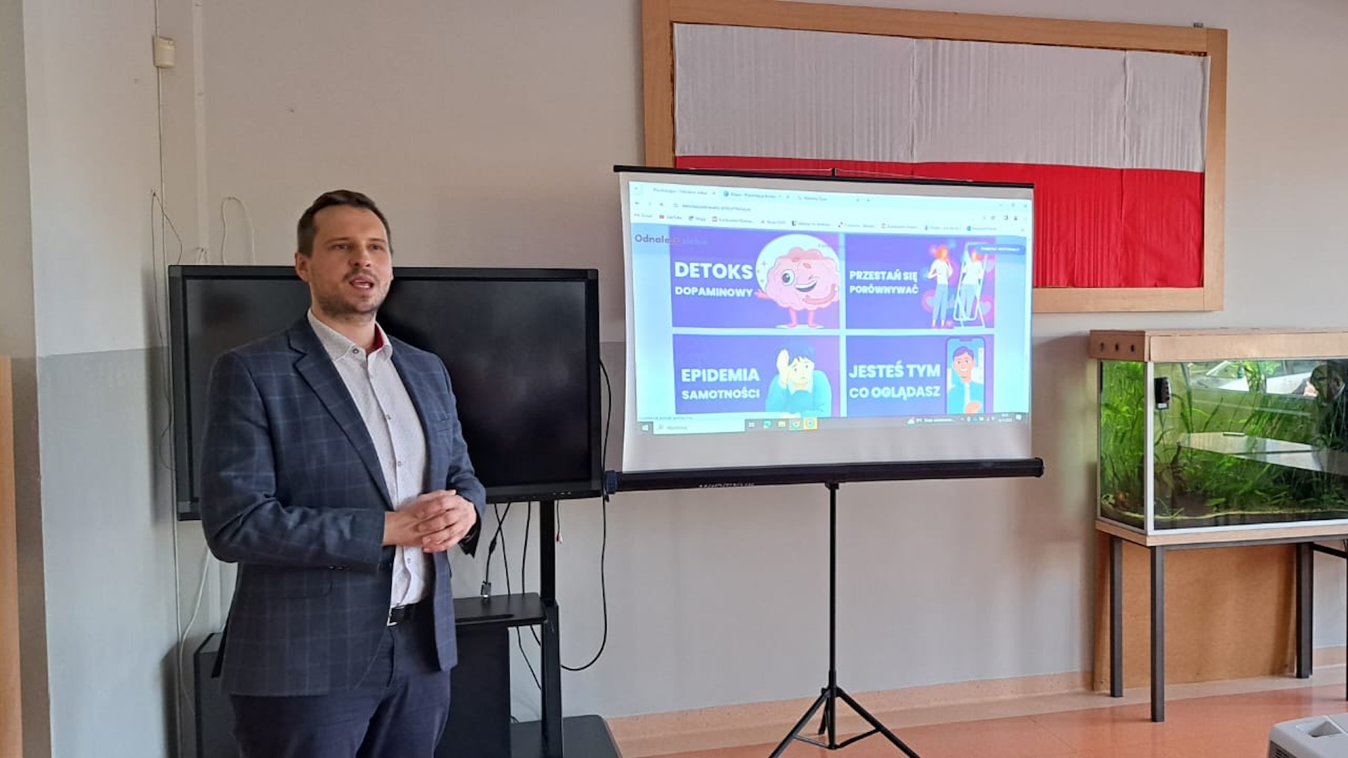 Drugą część spotkania dedykowano klasom VII i VIII, którym zaprezentowano i omówiono platformę edukacyjną „Odnaleźć siebie” jako wizualny pakiet treści wychowawczych, historycznych i społecznych przydatnych w szkole i środowisku pozaszkolnym. Do korzystania z narzędzia edukacyjnego zachęcał Tomasz Madej Dyrektor ORE, a w meandry tematyczne wprowadzili prezenterzy Brunon Różycki i Miłosz Rajczakowski. Zaproponowane treści zostały przyjęte z zainteresowaniem ,zarówno przez uczniów jak i nauczycieli, i deklaracją ich kontynuacji w ramach zajęć szkolnych.