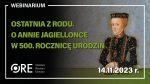 14 listopada 2023 r. Wydział Rozwoju Kompetencji Społecznych i Obywatelskich ORE zorganizował webinarium „Ostatnia z rodu. O Annie Jagiellonce w 500. rocznicę urodzin”. W ramach szkolenia dr hab. Agnieszka Januszek-Sieradzka z Katolickiego Uniwersytetu Lubelskiego Jana Pawła II wygłosiła dwa referaty: „Zmierzch Jagiellonów, świt Rzeczypospolitej Obojga Narodów” oraz „Anna Jagiellonka (1523-1596) – życie, działalność, pamięć”. W webinarium wzięło udział 50 nauczycieli historii oraz innych przedmiotów humanistycznych, którzy wysoko ocenili prezentowaną tematykę.