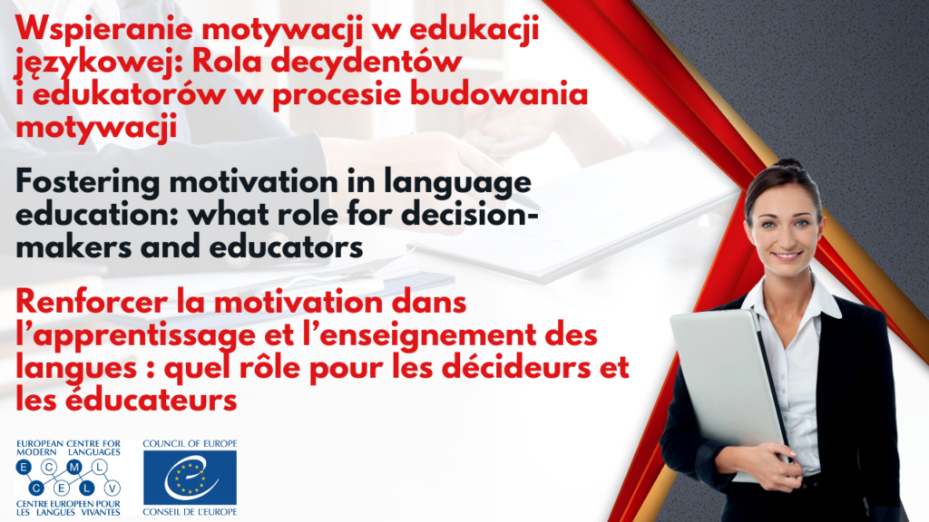 ECML ogłasza nabór chętnych do udziału w spotkaniu (THINK TANK) poświęconym wspieraniu motywacji w edukacji językowej. Złożą się na nie prezentacje, prace grupowe i dyskusje panelowe. Ich celem jest wzmocnienie świadomości znaczenia roli motywacji i określenie głównych czynników na nią wpływających z uwzględnieniem specyfiki danego kraju.