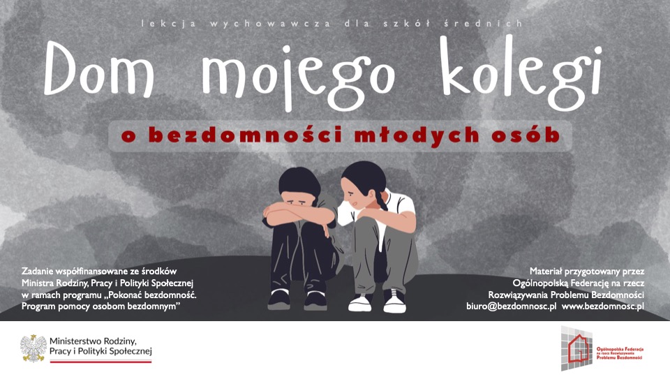 Ogólnopolska Federacja na rzecz Rozwiązywania Problemu Bezdomności przygotowała konspekt lekcji „Dom mojego kolegi”. Powstał on w ramach projektu współfinansowanego przez Ministerstwo Rodziny, Pracy i Polityki Społecznej. Proponowana lekcja może się przyczynić do zapobiegania narastającemu zjawisku bezdomności wśród młodzieży.