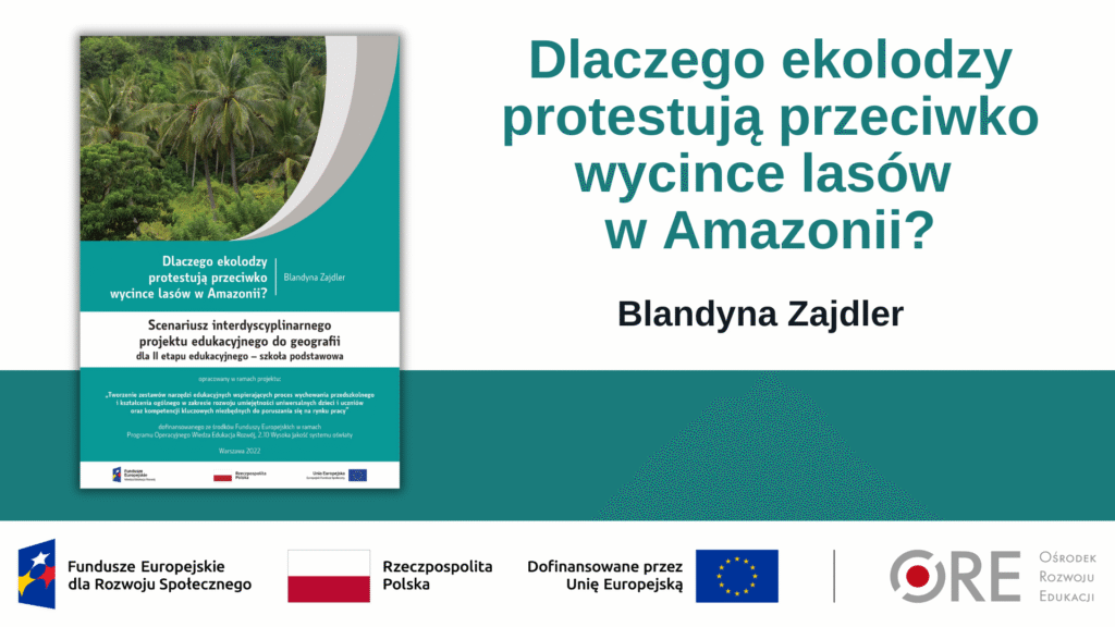 Do wykorzystania na zajęciach polecamy scenariusz projektu edukacyjnego „Dlaczego ekolodzy protestują przeciwko wycince lasów w Amazonii?” autorstwa Blandyny Zajdler (geografia dla II etapu edukacyjnego – szkoła podstawowa). To interdyscyplinarna propozycja dla szkół, którym bliska jest troska o przyszłość planety. Projekt splata naukę, przyrodę i refleksję o ekologii.