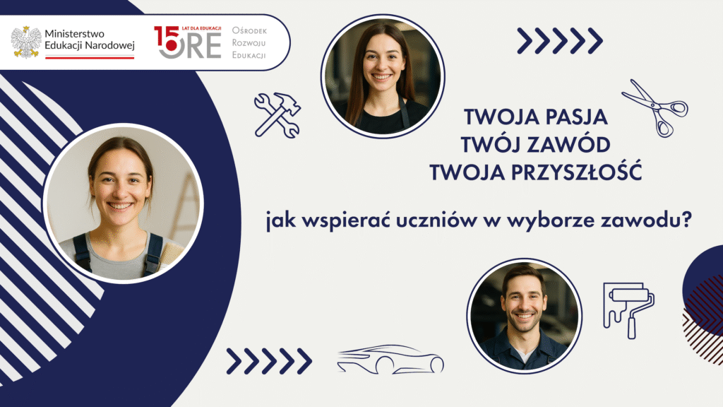 Wydział Kształcenia Zawodowego i Doradztwa Zawodowego ORE wraz z Departamentem Kształcenia Zawodowego MEN zapraszają doradców zawodowych ze szkół podstawowych z województwa mazowieckiego i wielkopolskiego do udziału w szkoleniu hybrydowym „Twoja pasja – Twój zawód – Twoja przyszłość – jak wspierać uczniów w wyborze zawodu?”.