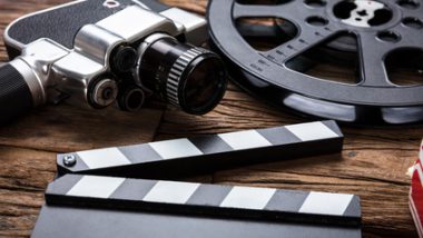 Closeup of movie camera with film reel and clapper board on wood