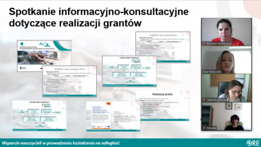 22 kwietnia 2021 r. odbyło się spotkanie informacyjno-konsultacyjne dotyczące realizacji grantów w ramach projektu „Wsparcie placówek doskonalenia nauczycieli i bibliotek pedagogicznych w realizacji zadań związanych z przygotowaniem i wsparciem nauczycieli w prowadzeniu kształcenia na odległość”. W spotkaniu online uczestniczyli przedstawiciele placówek, którym przyznano dofinansowanie na realizację grantu do 10 rundy otwartego konkursu grantowego oraz zespół projektowy ORE.