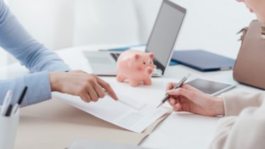 Financial advisor and woman meeting in the office, the customer is reading and signing a contract