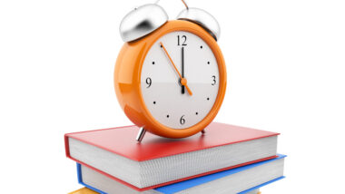 Alarm clock standing on stack of books. 3D Isolated on white