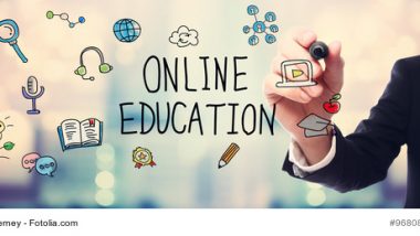 Businessman drawing Online Education concept on blurred abstract background_Fotolia