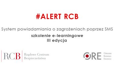 Zachęcamy do zapoznania się z materiałami edukacyjnymi i skorzystania z oferty szkolenia e-learningowego „#ALERT RCB system powiadamiania o zagrożeniach poprzez SMS”.